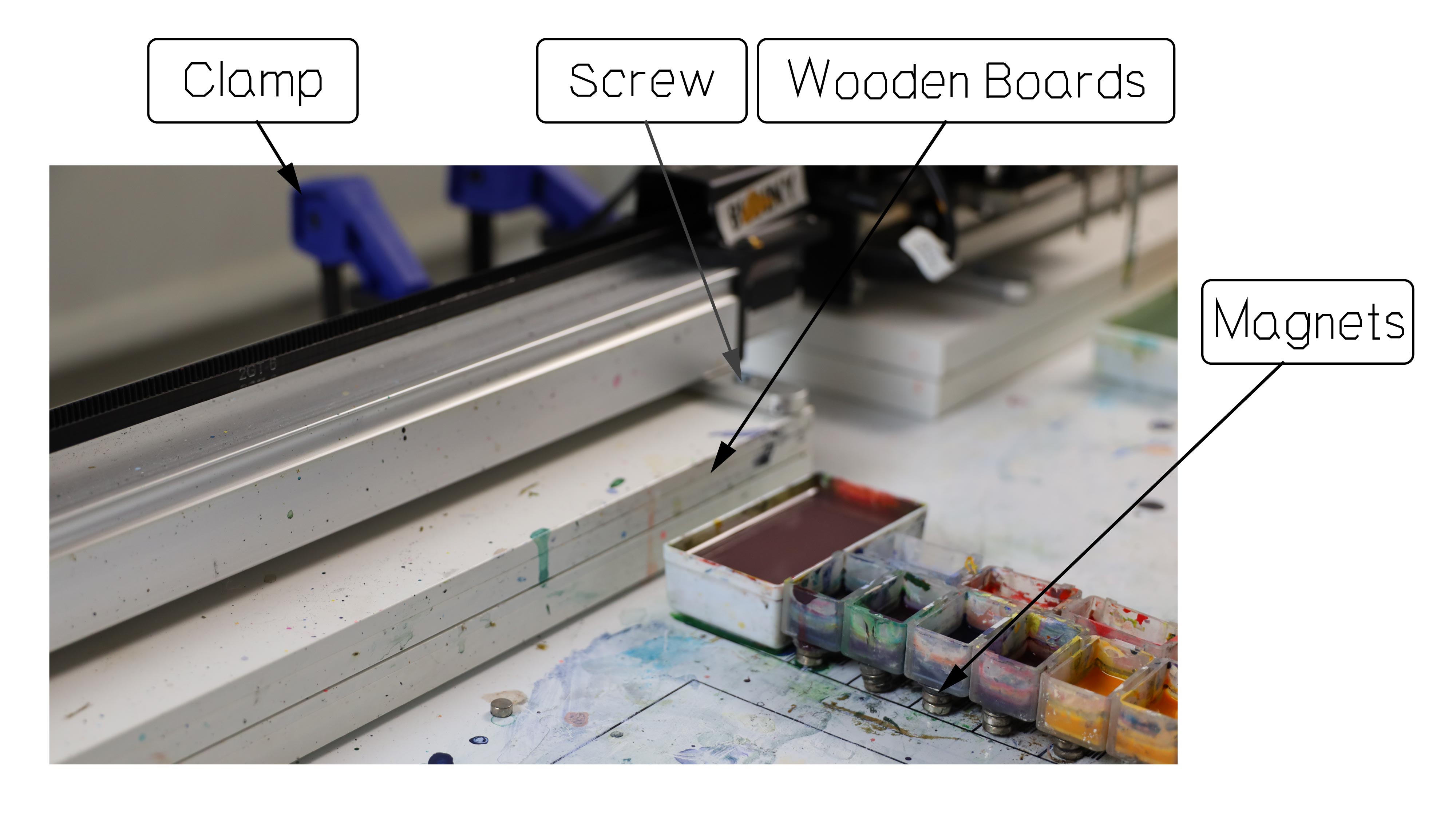 I use clamps, screws, staples, and magnets to fix everything used in the plotting process. The only thing moving on the table should be the plotter arm. If I accidentally bump into my table, nothing should move or fall off the table.