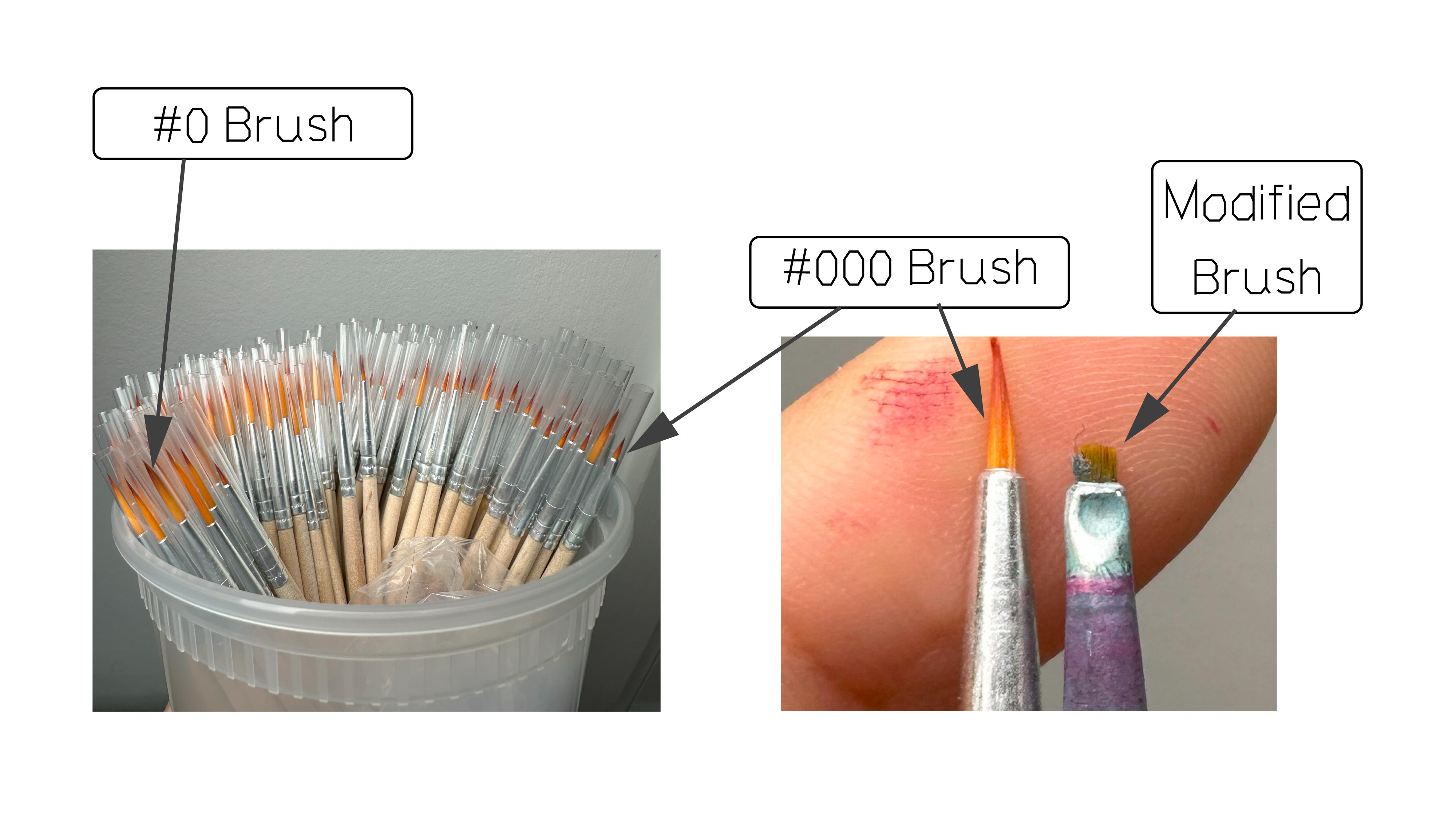 I use modified, extra-fine watercolor brushes. They are the finest brushes I can find on the market. I cut them down into a couple of millimeters long.