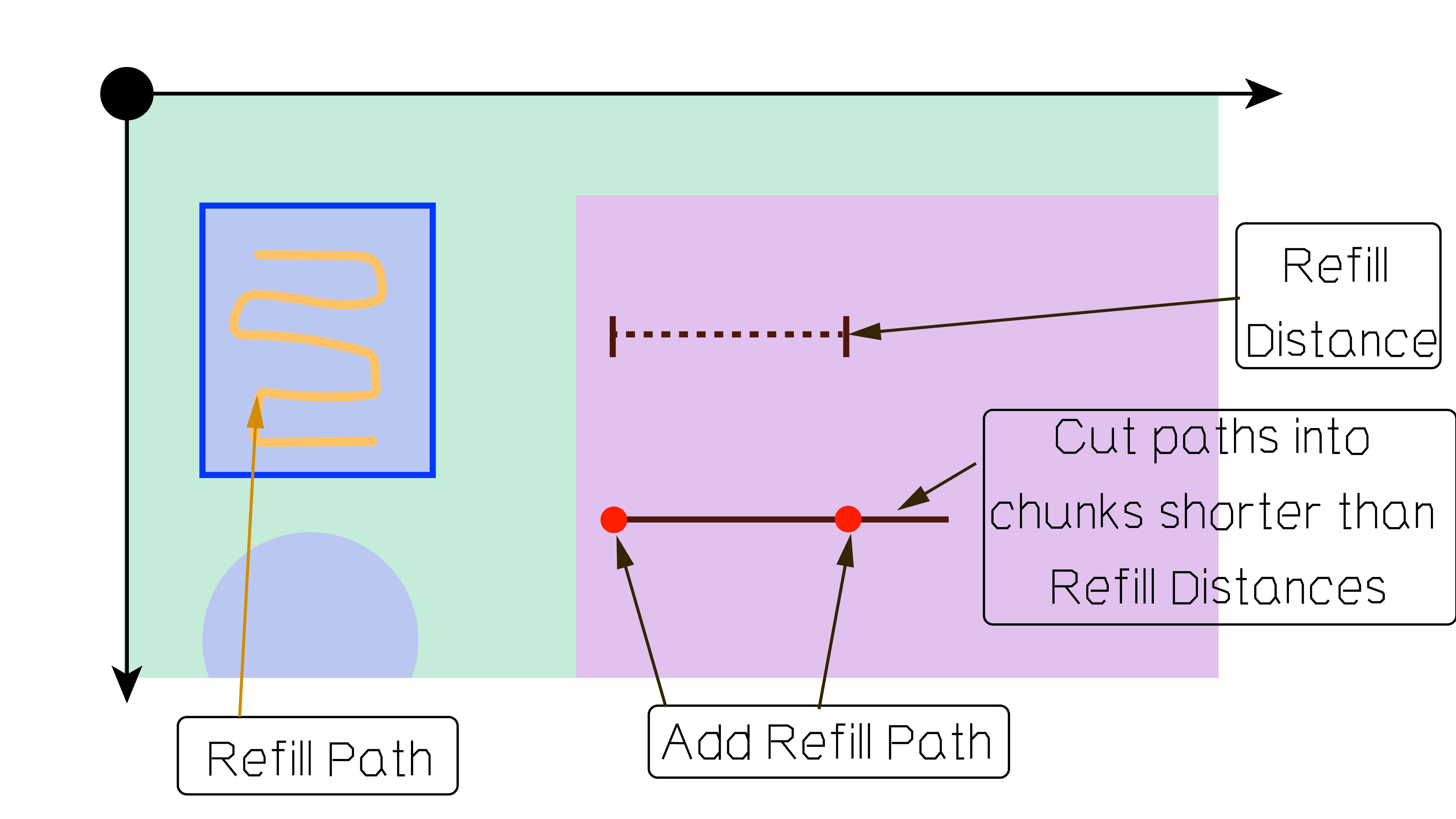 Figure 9: key aspects of plotter paintings instructions: decides where to refill (define refill distance) and how to refill (define refill path).